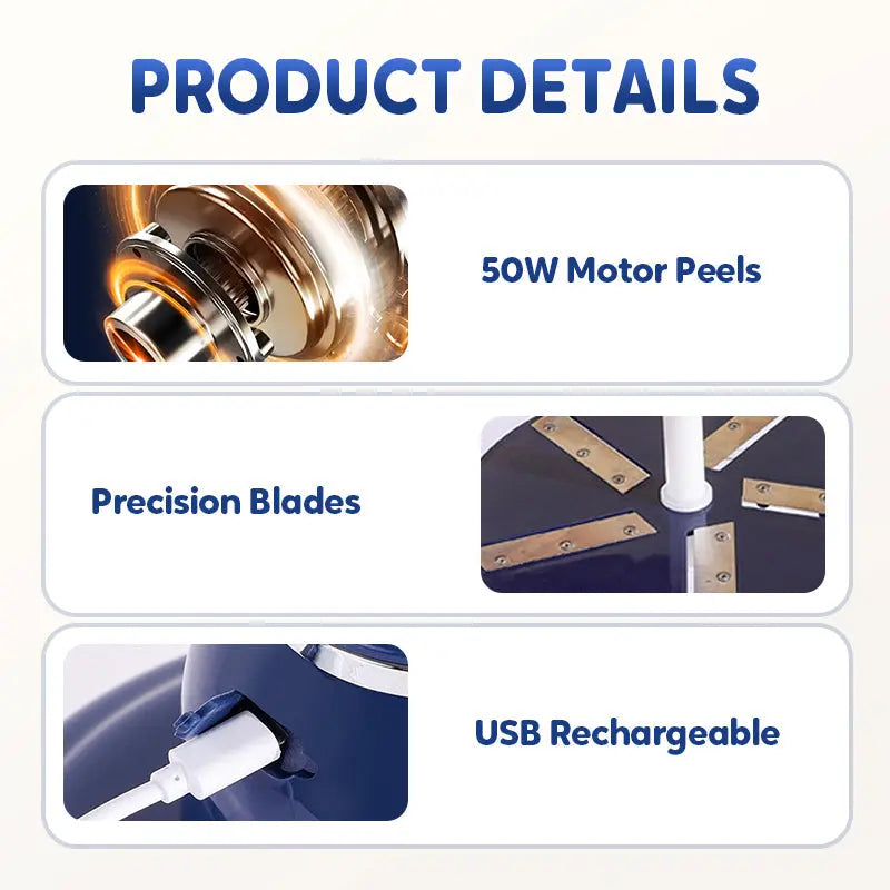 Peel like magic, no sweat, no mess – Simply press a button and let the machine do the work – perfectly peeled fruit in just 25 seconds. The 50W motor peels powerfully, yet remains whisper-quiet thanks to intelligent cooling technology that prevents overheating.