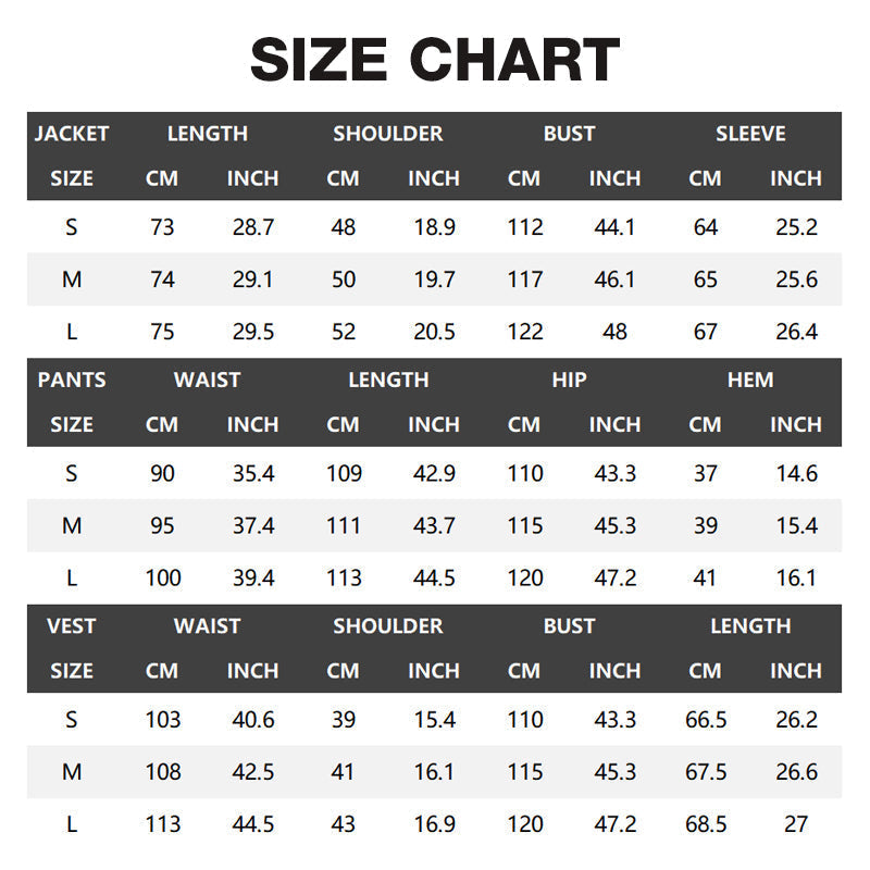 THREE-PIECE ENSEMBLE - Includes a matching jacket, vest, and trousers for a complete, coordinated look. This saves you time and effort in styling, ensuring you always appear polished and put-together for any formal event.